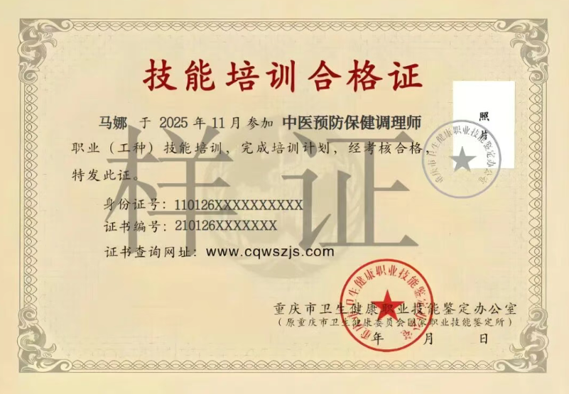 重庆市卫生健康职业技能鉴定办公室中医预防保健调理师证书样本
