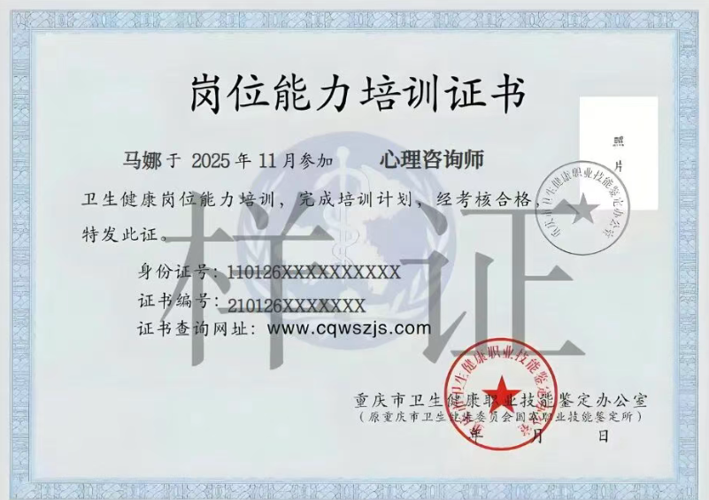 重庆市卫生健康职业技能鉴定办公室心理咨询师证书样本