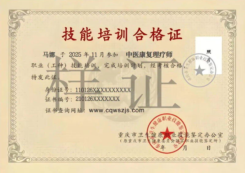 重庆市卫生健康职业技能鉴定办公室中医康复理疗师证书样本